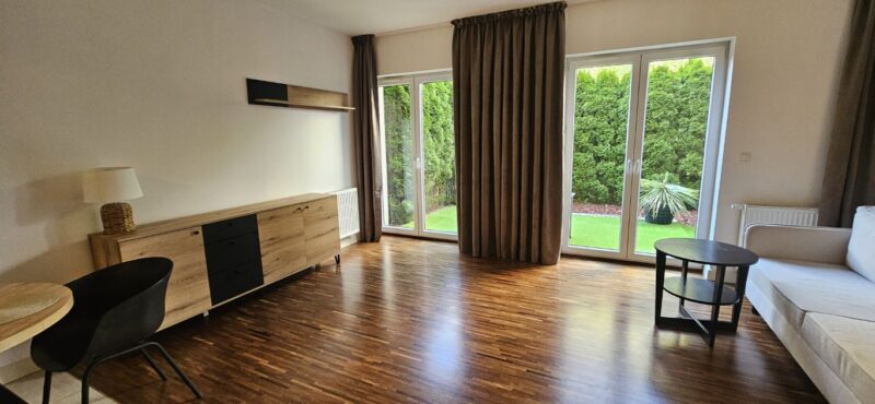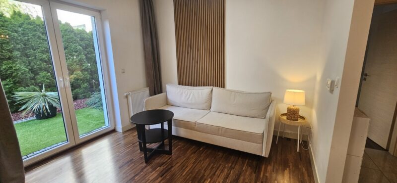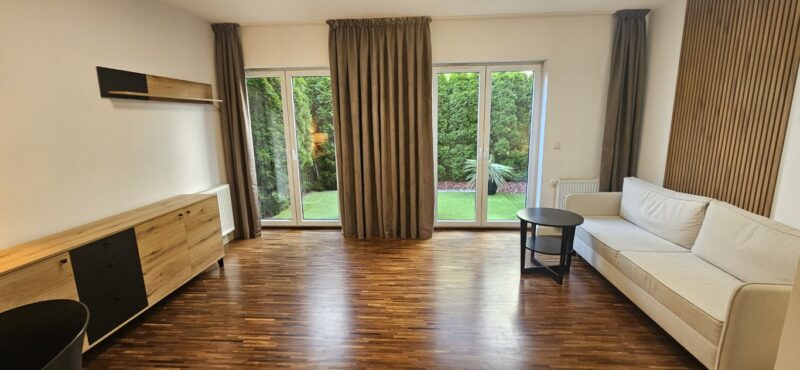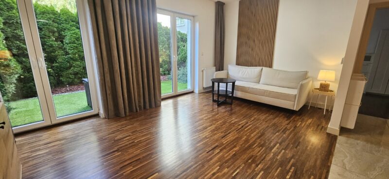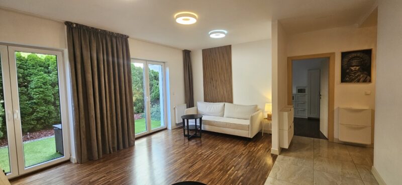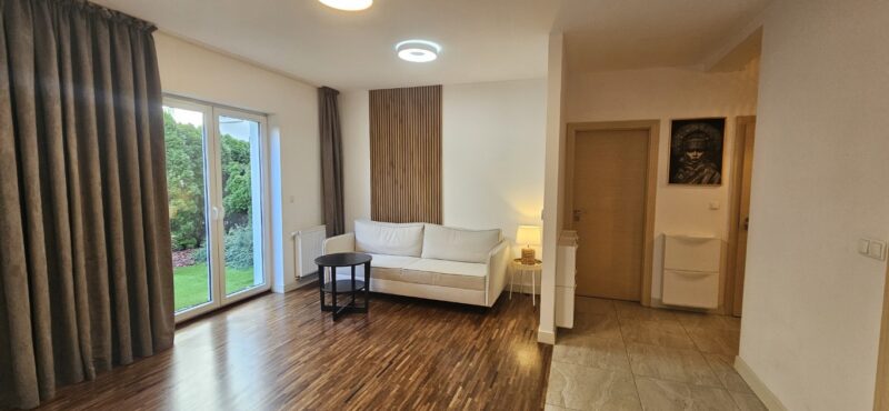 Nieruchomość ma powierzchnię 55,5m2. Składa się z pokoju dziennego z otwartą kuchnią, sypialni, łazienki, przedpokoju oraz pięknie urządzonego ogródka.