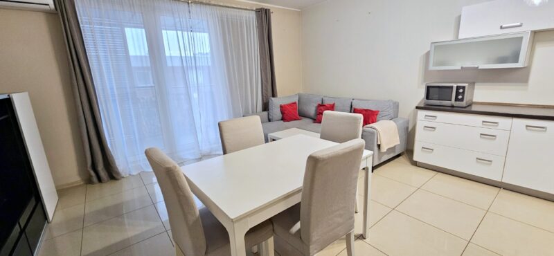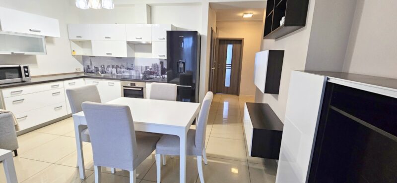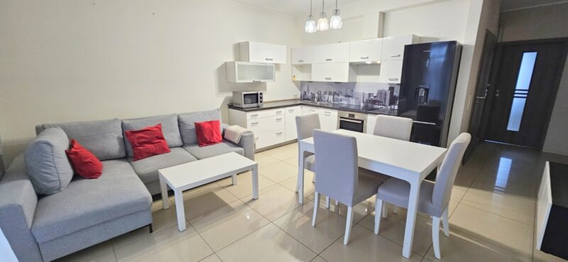 Przedmiotem oferty jest trzypokojowe mieszkanie, które składa się z pokoju dziennego z otwartą kuchnią, z którego wychodzi się na duży 8-metrowy balkon, dwóch sypialni, dużej łazienki oraz przedpokoju. Do mieszkania przynależy komórka lokatorska w cenie 20000zł. Istnieje opcja zakupu garażu do mieszkania w cenie 50000zł.
